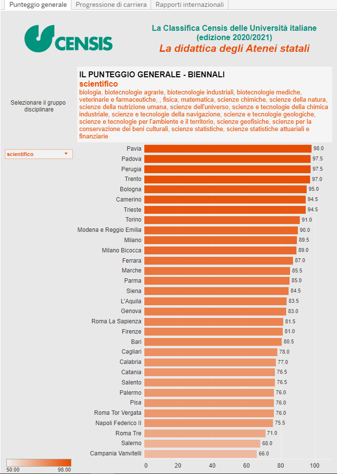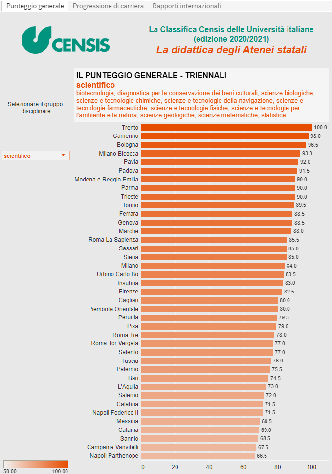 Il basso punteggio ottenuto nel parametro relativo ai rapporti internazionali (67 punti) si conferma il tasto dolente di Unict anche per le biennali, dove il punteggio aumenta ma di solo un punto. Tuttavia, l’Università di Catania nella seconda lista stilata dal Censis compie un vero e proprio balzo in avanti grazie al parametro “progressione di carriera”, per il quale Unict totalizza 85 punti, più di diversi atenei del Centro-Nord. Da ciò si può evincere che gli studenti dell’ateneo catanese nel gruppo scientifico riescono a mantenere un elevato tasso di regolarità negli studi, laureandosi nei tempi previsti in percentuali maggiori rispetto ai colleghi di altri atenei. Unict si piazza quindi ventunesima nella classifica università Matematica per le biennali, anche se resta da lavorare soprattutto sul settore internazionalizzazione per rendersi appetibili all’estero ma anche nel resto della Penisola.