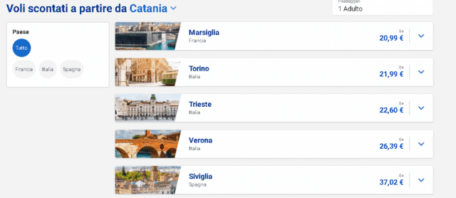 Anche se le offerte disponibili non sono molte, ciò non significa che non siano convenienti. Ryanair propone voli scontati a partire da Catania verso diverse destinazioni. Ad esempio, è possibile volare a Marsiglia con tariffe a partire da 20,99 €, a Torino da 21,99 €, a Trieste da 22,60 €, a Verona da 26,39 € e infien, la più cara, Siviglia raggiungibile con 37,02 €.