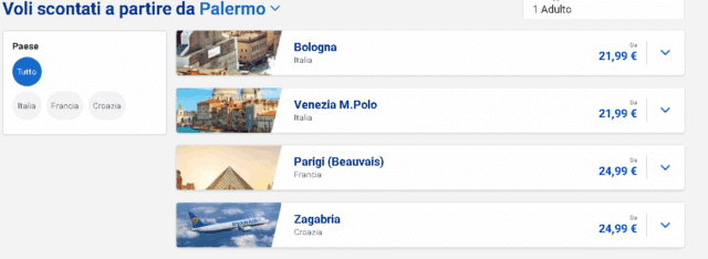 Ryanair offre voli scontati a partire da Palermo verso diverse affascinanti destinazioni. Con tariffe a partire da soli 21,99 €, è possibile volare a Bologna o Venezia Marco Polo, entrambe opzioni perfette per un weekend in Italia. Se si desidera esplorare l’Europa, Parigi (Beauvais) è raggiungibile da 24,99 €. Allo stesso prezzo anche Zagabria, capitale della Croazia.