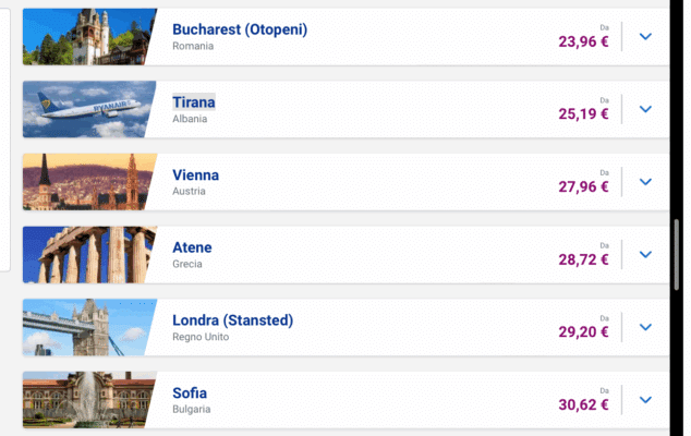 Se parti da Catania, questa Offerta Flash di Ryanair รจ lโoccasione perfetta per organizzare una fuga autunnale senza spendere una fortuna. I voli scontati partono da 14 euro, con tante destinazioni europee raggiungibili a meno di 30 euro. Tra le tratte piรน care figuranoย Bucarest con soli 23,96โฏโฌ, oppure scegliere mete come Tirana (da 25,19โฏโฌ), Vienna (da 27,96โฏโฌ), Atene (da 28,72โฏโฌ), Londra Stansted (da 29,20โฏโฌ) o Sofia (da 30,62โฏโฌ).