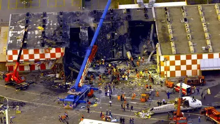 In pochi secondi, un luogo di partenze e abbracci si trasforma in un inferno di fiamme, fumo e morte.