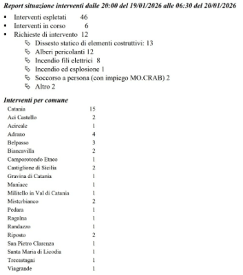 Arriva il primo report dal comando provinciale dei vigili del fuoco di Catania relativo agli interventi effettuati in relazione al passaggio del ciclone Harry. Un primo bilancio, che riguarda il periodo tra le 20:00 del 19 gennaio e le 06:30 di oggi, segnala che le squadre dei vigili del fuoco hanno completato 46 interventi su tutto il territorio di competenza. Al momento della rilevazione, risultano ancora in corso 6 operazioni, con 12 nuove richieste di intervento. Di seguito gli interventi effettuati.