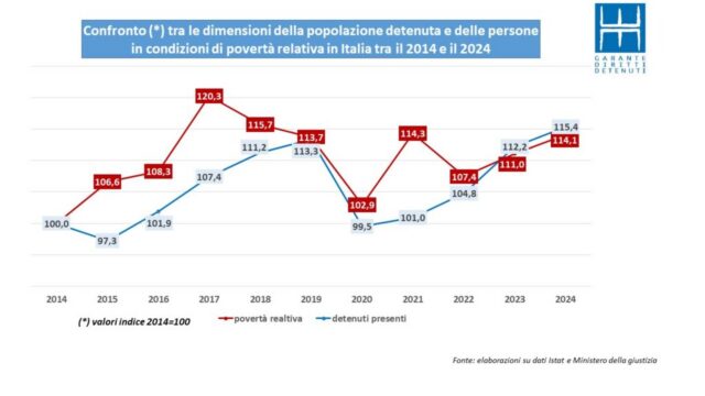 Il report analizza il decennio 2014-2024 dove emerge un parallelismo impressionante: il numero dei detenuti è aumentato del 15,4% mentre la popolazione in povertà relativa è cresciuta del 14,1%. Il coefficiente di correlazione statistica conferma un legame significativo, solo in parte attenuato delle misure straordinarie di decongestionamento adottate durante la pandemia.