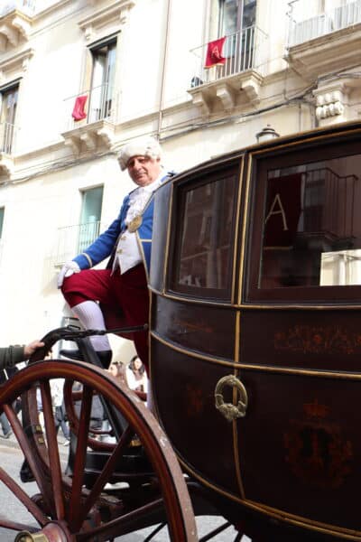 A rendere ancora più suggestiva la sfilata è il corteo storico in costume che accompagna le carrozze. Figuranti in abiti d’epoca, avvolti in tonalità profonde di blu cobalto e bordeaux, con parrucche bianche, ricreano l’atmosfera di una Catania barocca e cerimoniale. Il passaggio delle carrozze lungo via Etnea e nel centro storico è accolto da ali di folla compatta, in un tempo sospeso che ogni anno si rinnova.