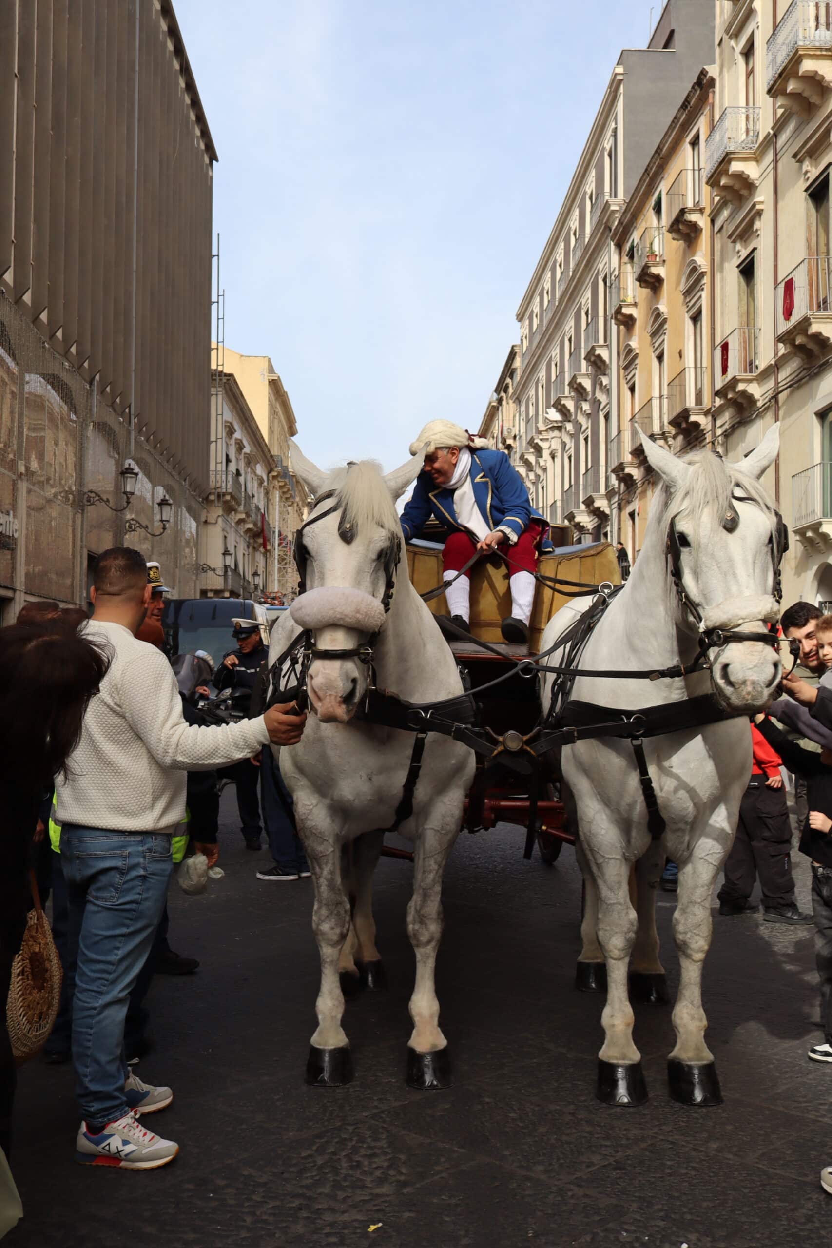 A rendere ancora più suggestiva la sfilata è il corteo storico in costume che accompagna le carrozze. Figuranti in abiti d’epoca, avvolti in tonalità profonde di blu cobalto e bordeaux, con parrucche bianche, ricreano l’atmosfera di una Catania barocca e cerimoniale. Il passaggio delle carrozze lungo via Etnea e nel centro storico è accolto da ali di folla compatta, in un tempo sospeso che ogni anno si rinnova.