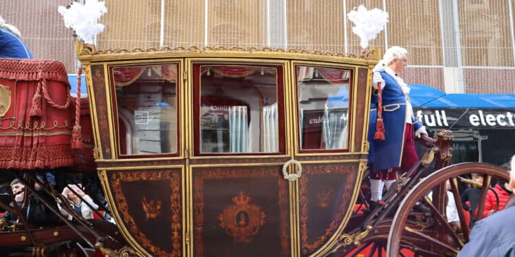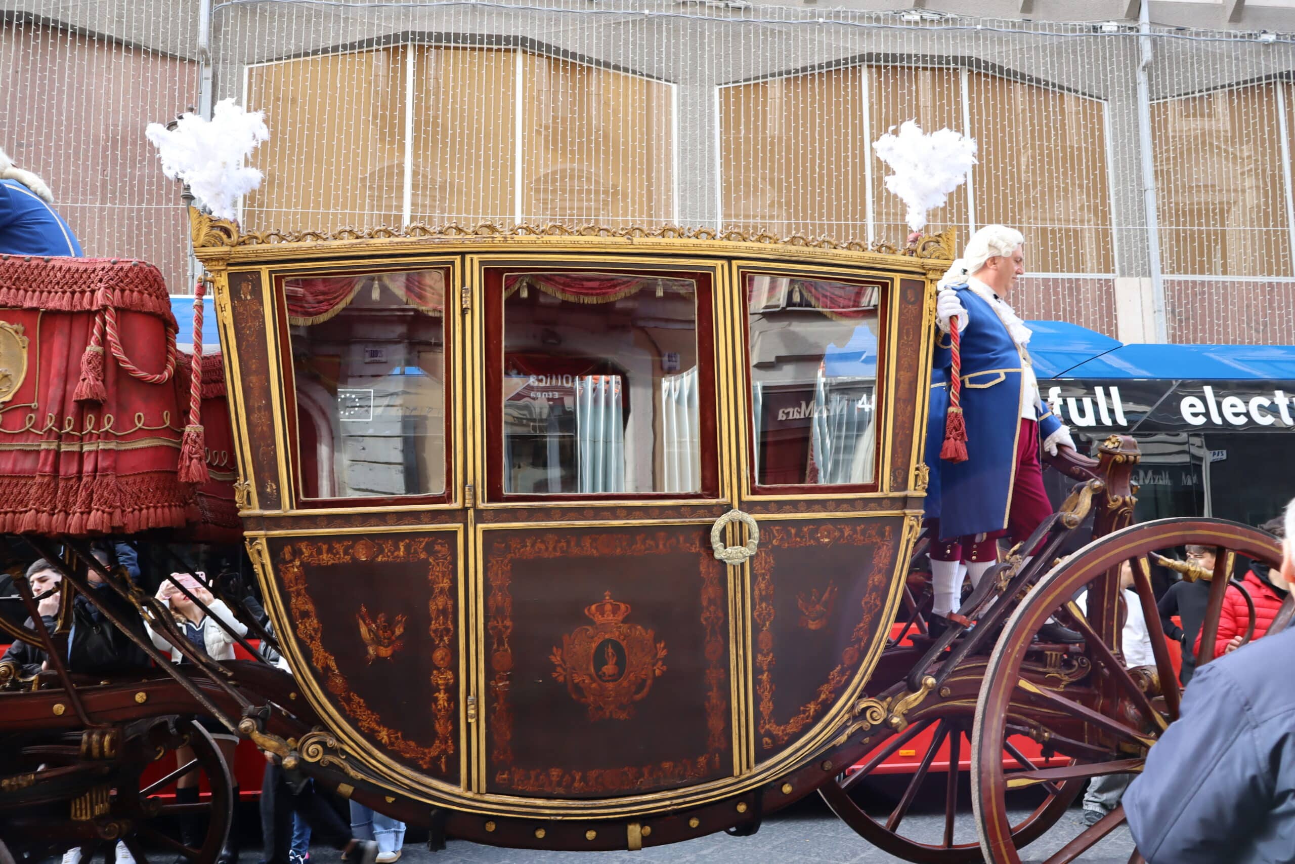 Alle sue spalle segue la seconda berlina, più sobria nelle dimensioni ma altrettanto raffinata, priva dei drappi rossi ma ricca di intarsi e decorazioni. Insieme, le due carrozze raccontano un’idea di istituzione che non si chiude in sé stessa, ma si espone, si mostra e dialoga con il popolo lungo le strade della città.