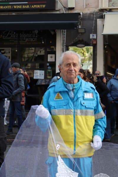 Tra la folla, lungo il percorso della festa, un uomo anziano tiene tra le mani un lungo tratto di velo. Non è un velo qualsiasi: fa parte del progetto artistico partecipativo Tu Sei Agata, ideato dall’artista Domenico Pellegrino. Un velo lungo quasi un chilometro, composto da ricami, pizzi e frammenti di memoria donati da centinaia di persone, da tutto il mondo, cuciti insieme per trasformare storie private in un’opera collettiva.