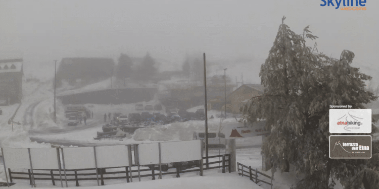 Scenario decisamente più severo sul vulcano. L’Etna si presenta oggi avvolta dalle nubi, con nevicate sparse oltre i 1500 metri. Lo zero termico, attestato intorno ai 1800 metri, sta garantendo una buona tenuta del manto nevoso, fondamentale per la stagione sciistica in corso.