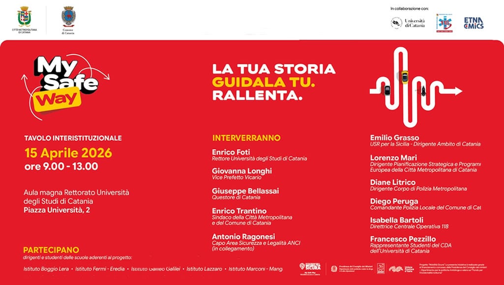 Oltre 800 studenti coinvolti, 346 controlli su strada effettuati e 56 violazioni accertate: sono questi alcuni dei numeri del progetto “My Safe Way – La tua storia guidala tu. Rallenta. Mobilità sicura a Catania”, che si avvia alla conclusione con il tavolo interistituzionale in programma mercoledì 15 aprile 2026, dalle ore 9:00 nell’Aula Magna del Rettorato dell’Università degli Studi di Catania.