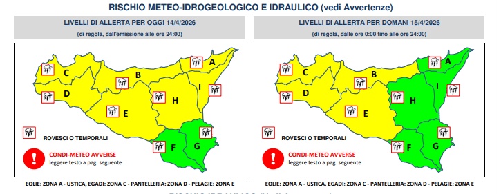 Anche per la giornata di domani la Protezione Civile ha esteso l’allerta gialla su tutta la Sicilia. Secondo le previsioni, i temporali tenderano ad allontanarsi progressivamente dall’isola, lasciando spazio a condizioni più variabili, con nubi irregolari e locali schiarite, ma ancora con la possibilità di piogge residue. Sono attesi rovesci soprattutto nelle aree di Caltanissetta, Enna, Palermo e Trapani, mentre nel resto della regione il cielo sarà in prevalenza nuvoloso o poco nuvoloso. Sul fronte delle temperature è previsto un generale calo termico. La giornata più mite sarà a Messina, con valori compresi tra 15 gradi e 21 gradi. A seguire Siracusa e Catania, dove le massime si manterranno intorno ai 19 gradi. Più fredda la provincia di Enna, con minime che potranno scendere fino a 9 gradi.