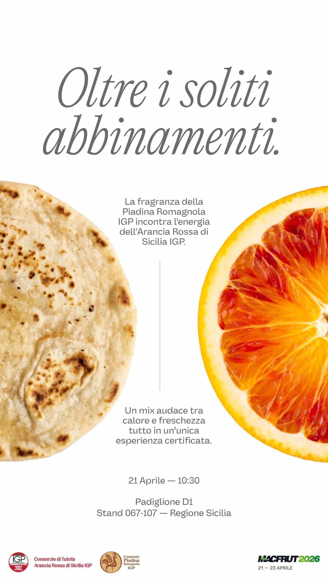 Tra gli appuntamenti più attesi figura l’evento “Oltre i Soliti Abbinamenti”, in programma martedì 21 aprile alle ore 10:30, che vedrà un originale “matrimonio” tra l’Arancia Rossa di Sicilia IGP e la Piadina Romagnola IGP. L’iniziativa nasce dalla collaborazione tra due Indicazioni Geografiche simbolo del Made in Italy agroalimentare e punta a valorizzare la versatilità dei prodotti certificati attraverso abbinamenti inediti e percorsi di degustazione. Un modo per raccontare non solo il gusto, ma anche la cultura e l’identità dei territori di provenienza, rafforzando il legame tra tradizione e innovazione.