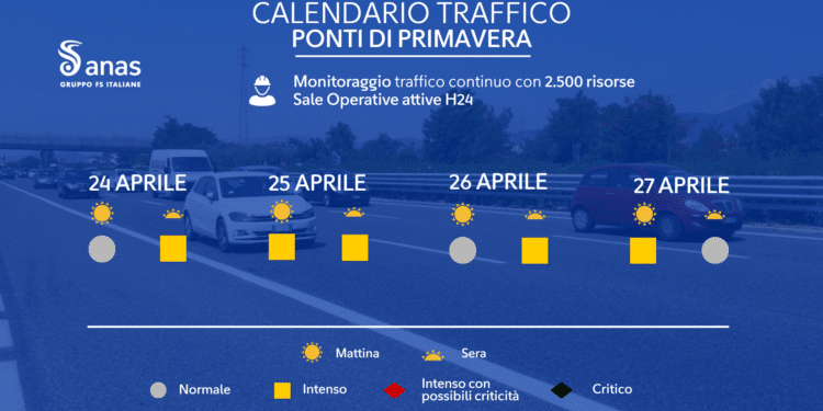 Maxi ponte tra 25 aprile e 1 maggio: 95 milioni di veicoli su strade e autostrade Anas. Picchi di traffico e mete preferite dagli italiani.