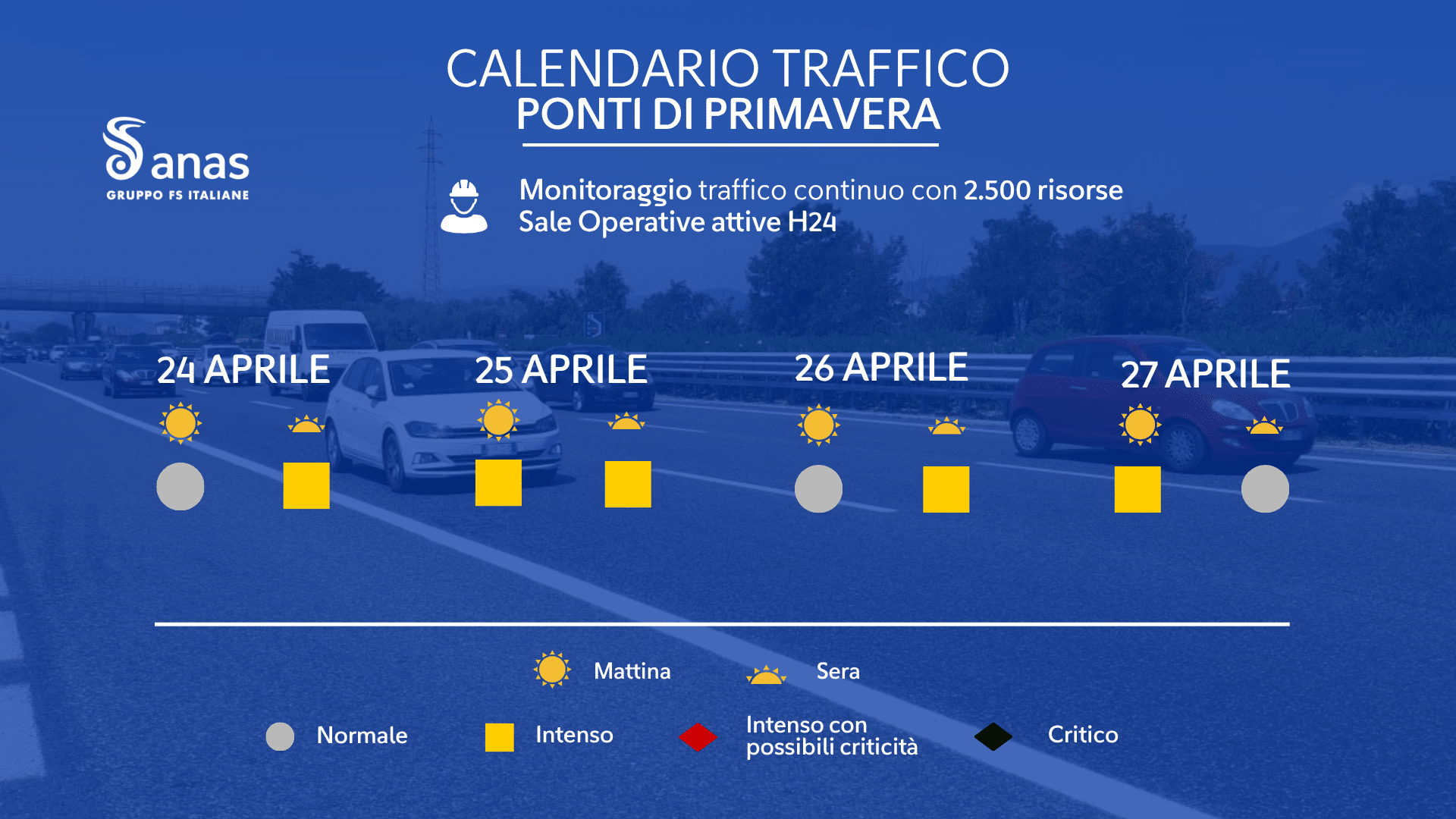 Nel dettaglio, già da oggi si registra un incremento della circolazione rispetto alla media settimanale, con una crescita stimata del +6%. Un trend simile è previsto anche per venerdì 24 aprile, mentre sabato 25 aprile si assisterà a un calo dell’11%, dovuto al fatto che gran parte degli spostamenti sarà già stata completata. Tuttavia, il flusso complessivo resterà sostenuto lungo tutta la rete, con un aumento progressivo dei veicoli diretti verso le principali destinazioni turistiche.